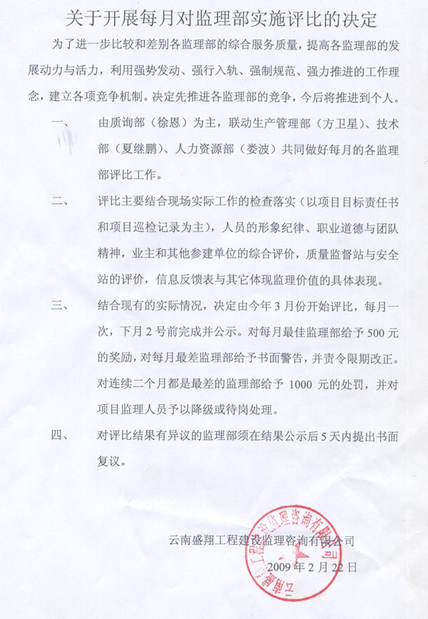 關(guān)于開展每月對監(jiān)理部實施評比的決定