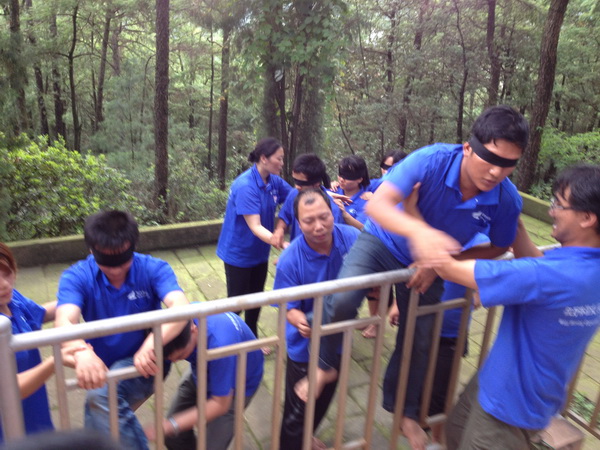 ??????? “生命之旅”:25名成員全部脫掉鞋襪、蒙上雙眼,不允許發(fā)出任何聲音,由教練選出12名成員解掉蒙著眼睛的布條,為還在蒙著雙眼的隊員引路,這樣的旅程很艱苦,需要走過荊棘、爬上高坑、攀登石蹲。
