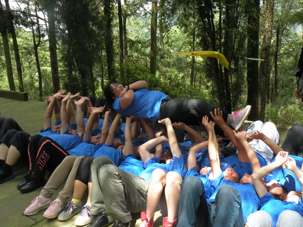 ??????? “潮起潮落”:所有隊員依次躺下,雙手臺起手掌與天空平行兩樣組成平行“人床”,一名隊員躺在“人床”上,其它隊員齊力用雙手將其進行傳遞,每人都要參與。