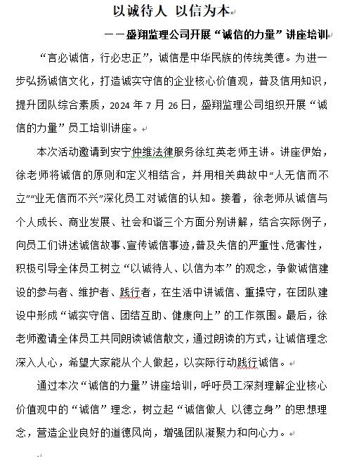 以誠(chéng)待人 以信為本 ——盛翔監(jiān)理公司開展“誠(chéng)信的力量”講座培訓(xùn)
