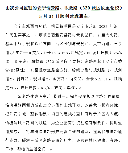 • 由我公司監(jiān)理的安寧鋼云路、職教路(320城區(qū)段至黨校) 5月31日順利建成通車