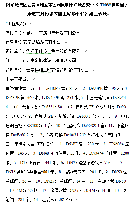 陽光城集團云貴區(qū)域云南公司昆明陽光城名苑小區(qū)T003#地塊居民用燃氣及設施安裝工程順利通過竣工驗收