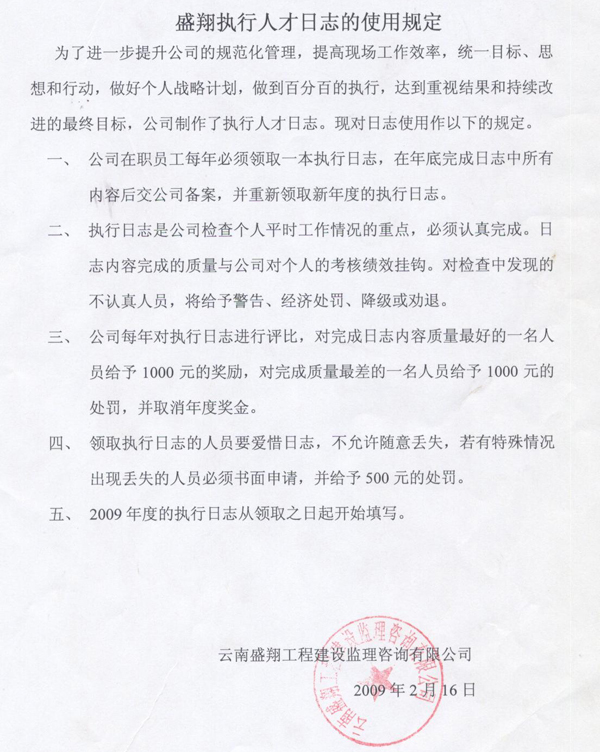 盛翔執(zhí)行人才日志的使用規(guī)定