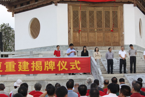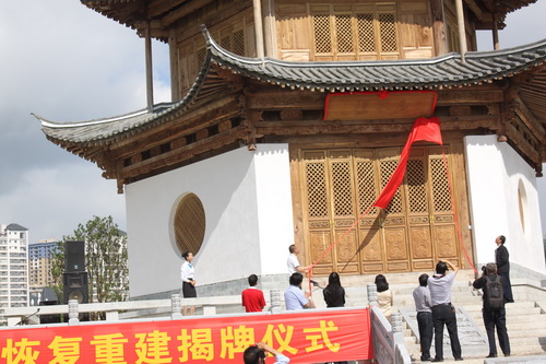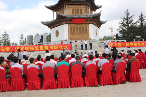 揭牌儀式現(xiàn)場副市長張宏斌介紹了古建筑遙岑樓、永安橋恢復(fù)重建工程的具體情況。市委書記李樹勇和原縣委書記賀成林共同為古建筑遙岑樓的恢復(fù)重建揭下牌匾蓋紅,宣告了安寧市的兩個(gè)文物級(jí)古建筑恢復(fù)重建建成。