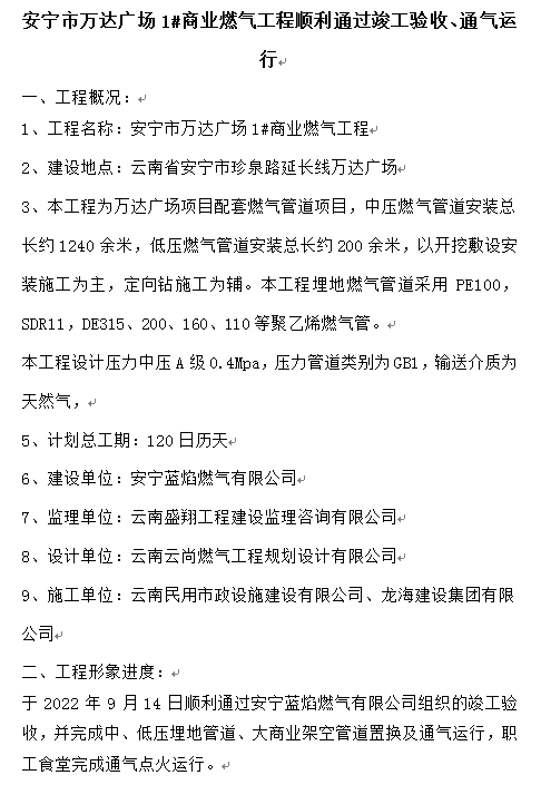 安寧市萬達(dá)廣場1#商業(yè)燃?xì)夤こ添樌ㄟ^竣工驗收、通氣運行