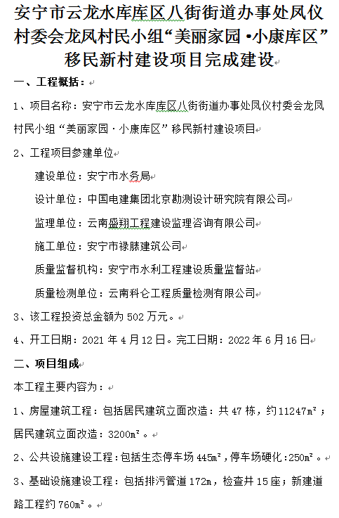 安寧市云龍水庫庫區(qū)八街街道辦事處鳳儀村委會(huì)龍鳳村民小組“美麗家園?小康庫區(qū)”移民新村建設(shè)項(xiàng)目完成建設(shè)