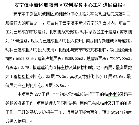 安寧滇中新區(qū)職教園區(qū)雙創(chuàng)服務中心工程進展簡報