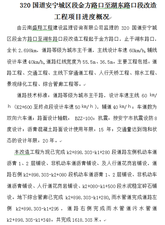 320國道安寧城區(qū)段金方路口至湖東路口段改造工程項(xiàng)目進(jìn)度概況