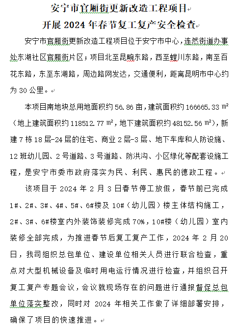 安寧市官廂街更新改造工程項(xiàng)目開(kāi)展2024年春節(jié)復(fù)工復(fù)產(chǎn)安全檢查