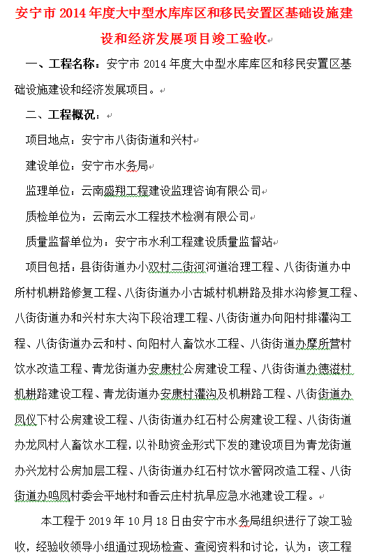 安寧市2014年度大中型水庫庫區(qū)和移民安置區(qū)基礎(chǔ)設(shè)施建設(shè)和經(jīng)濟(jì)發(fā)展項(xiàng)目竣工驗(yàn)收
