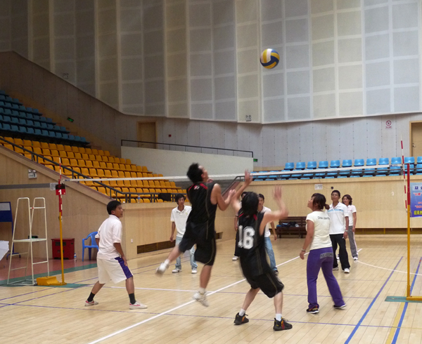 ??? 比賽中,不管是運(yùn)動(dòng)員還是拉拉隊(duì),都沉浸在緊張而激烈的競(jìng)賽氛圍中。賽場(chǎng)上,籃球、排球和拔河比賽對(duì)參賽隊(duì)員的團(tuán)結(jié)協(xié)作能力以及帶隊(duì)人員的組織、策略公關(guān)能力都提出了更高的要求。賽場(chǎng)邊,帶隊(duì)人員不時(shí)指揮隊(duì)員“作戰(zhàn)”,而參賽隊(duì)員也不斷總結(jié)經(jīng)驗(yàn),相互打氣,調(diào)整策略。各隊(duì)之間為大家上演了一場(chǎng)場(chǎng)實(shí)力、心理以及策略對(duì)抗的激烈表演。