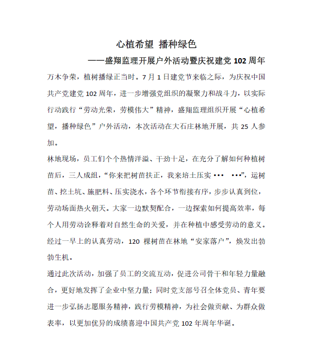 心植希望 播種綠色 ——盛翔監(jiān)理開展戶外活動(dòng)暨慶祝建黨102周年