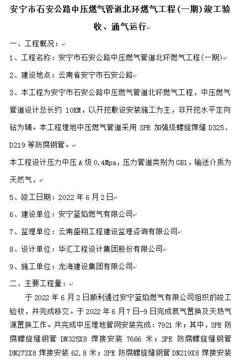安寧市石安公路中壓燃氣管道北環(huán)燃氣工程(一期)竣工驗收、通氣運行
