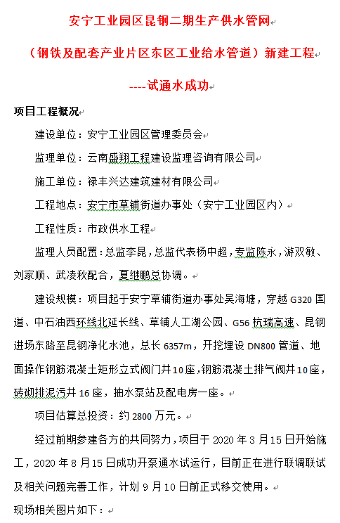 安寧工業(yè)園區(qū)昆鋼二期生產(chǎn)供水管網(wǎng)(鋼鐵及配套產(chǎn)業(yè)片區(qū)東區(qū)工業(yè)給水管道)新建工程試通水成功