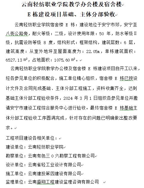 • 云南輕紡職業(yè)學(xué)院教學(xué)辦公樓及宿舍樓E棟建設(shè)項(xiàng)目基礎(chǔ)、主體分部驗(yàn)收