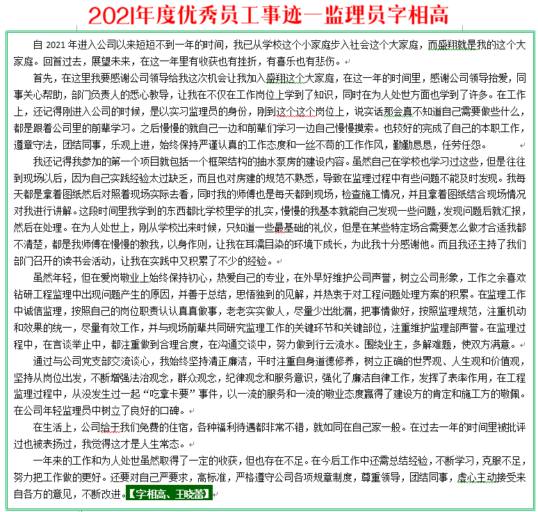 2021年度優(yōu)秀監(jiān)理員字相高先進(jìn)事跡