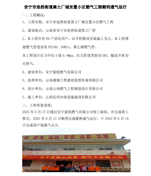 安寧市連然街道黑土廠城安置小區(qū)燃?xì)夤こ添樌膺\(yùn)行