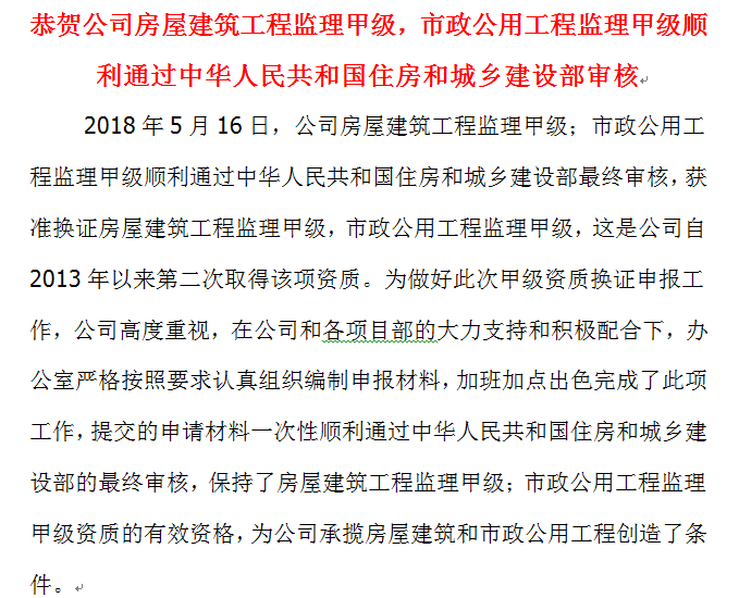 恭賀公司房屋建筑工程監(jiān)理甲級;市政公用工程監(jiān)理甲級順利通過中華人民共和國住房和城鄉(xiāng)建設部審核