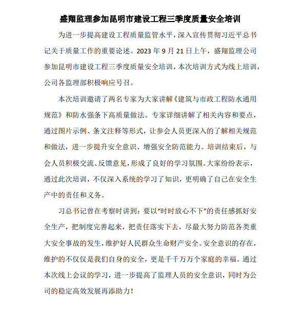 盛翔監(jiān)理參加昆明市建設(shè)工程三季度質(zhì)量安全培訓(xùn)