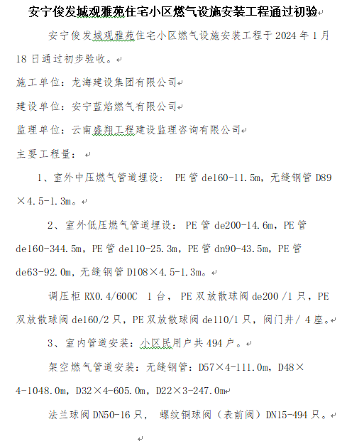 安寧俊發(fā)城觀雅苑住宅小區(qū)燃氣設施安裝工程通過初驗