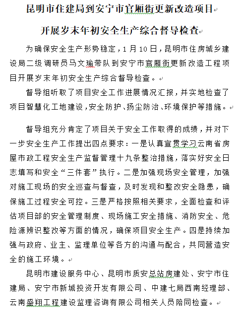 昆明市住建局到安寧市官廂街更新改造項目開展歲末年初安全生產(chǎn)綜合督導(dǎo)檢查