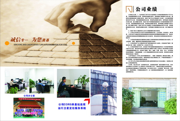 幾年來,我公司力求“以質(zhì)量求生存,以信譽(yù)求發(fā)展”的宗旨服務(wù)于社會,在社會各屆的大力支持和廣大工程技術(shù)人員的辛勤工作下,測繪項(xiàng)目遍及云南省各地區(qū),為云南省地方建設(shè)做出了積極的貢獻(xiàn)。在今后的工作中,公司依靠“信守合同、科技領(lǐng)先”的經(jīng)營理念,不斷提高測繪水平,以一流的測繪成果服務(wù)客戶,以一流的測繪業(yè)績奉獻(xiàn)社會。