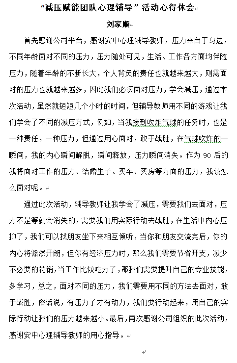 “減壓賦能團隊心理輔導”活動心得體會—— 劉家順