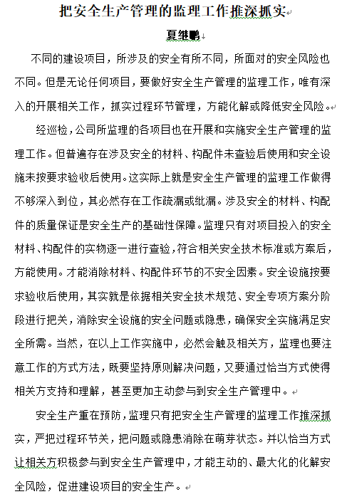 把安全生產(chǎn)管理的監(jiān)理工作推深抓實(shí) 夏繼鵬